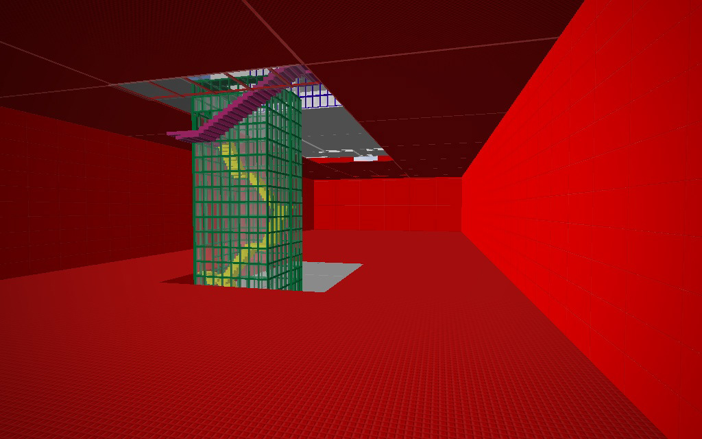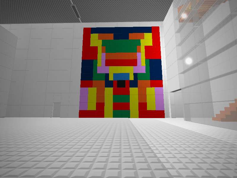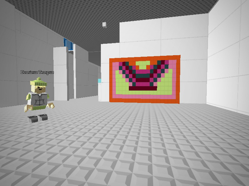 "Utilizing a busy online multiplayer game called Blockland, created by Eric Hartman, I set to work in painting and sculpting in game, painting with digital bricks and a paint tool. I wandered studios tremendously more spacious than were physically available to me and invited others to join me in the study of geometric abstraction."